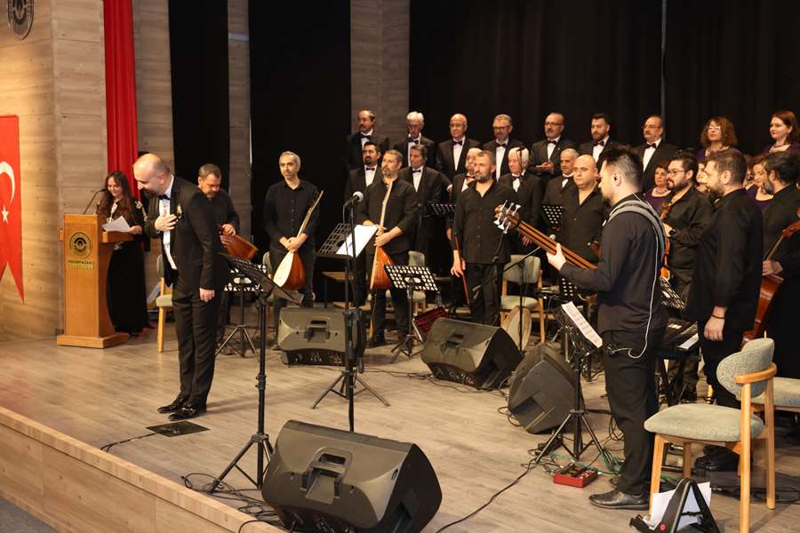 Türk Halk Müziği Koro Konseri, Şef Kenan Pekgöz yönetiminde Anadolu’nun zengin ezgilerini dinleyicilerle buluşturdu. Sunuculuk Atölyesi ve Halk Oyunları Ekibi’nin katkılarıyla zenginleşen program, yalnızca bir konser değil; kültürün, sözün ve ritmin iç içe geçtiği özel bir buluşmaya dönüştü. Anadolu’nun dört bir yanından derlenen türküler, salonu dolduran izleyiciler tarafından coşkuyla karşılandı; kimi zaman hüzünlü, kimi zaman neşeli melodiler, ortak hafızada yankı buldu.