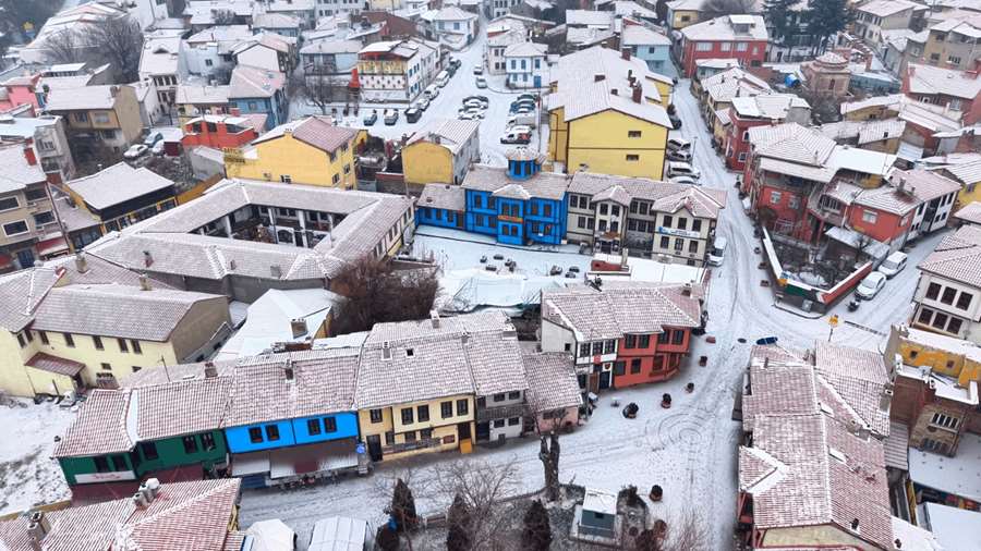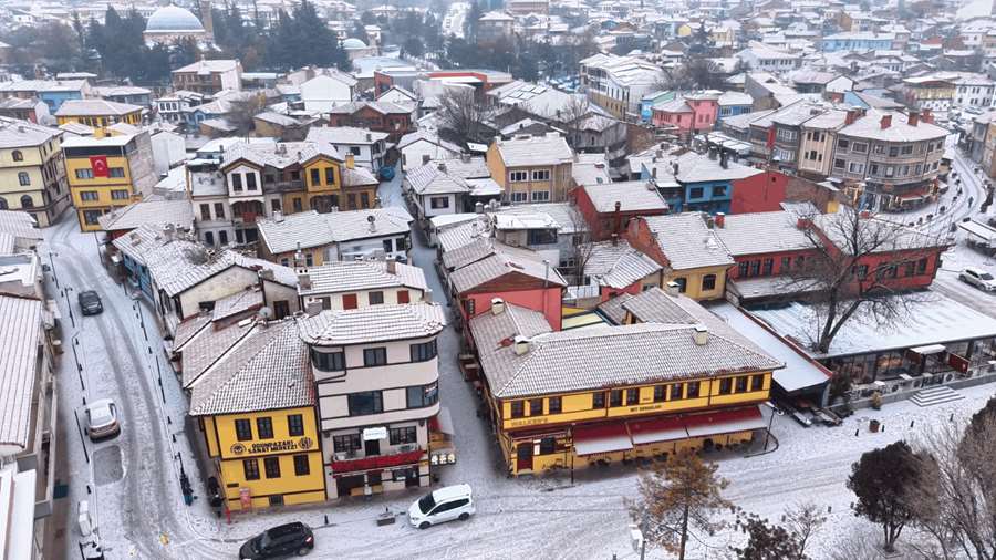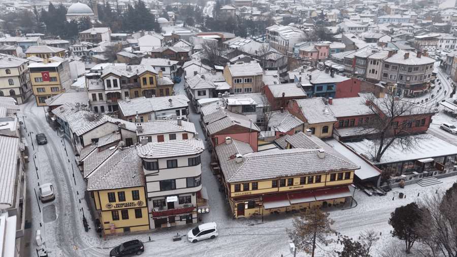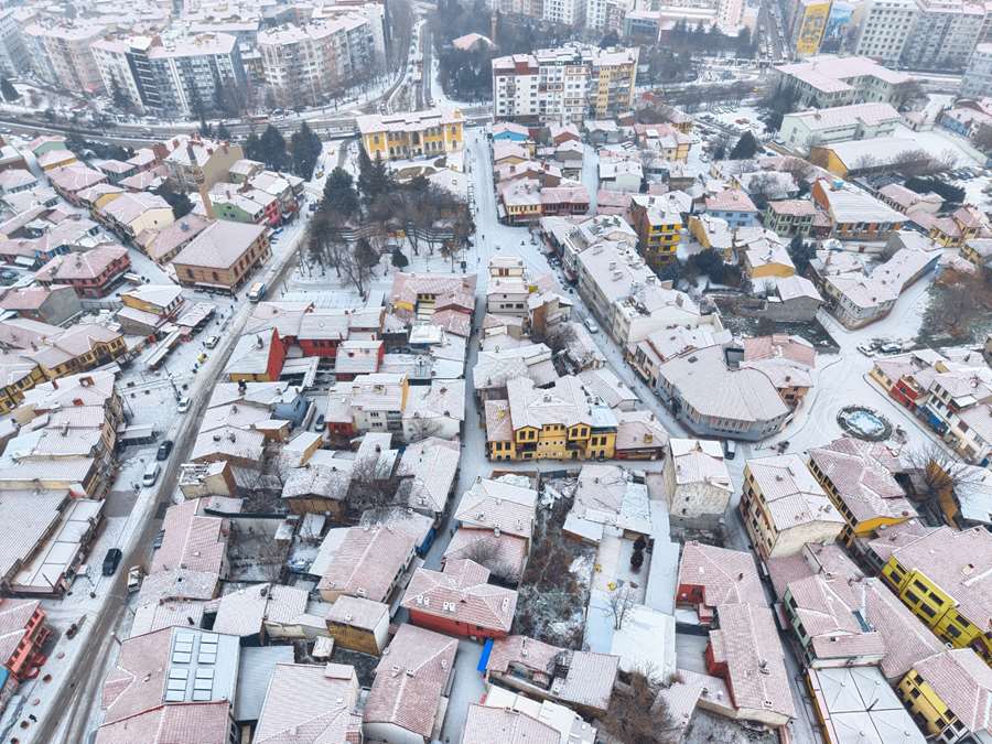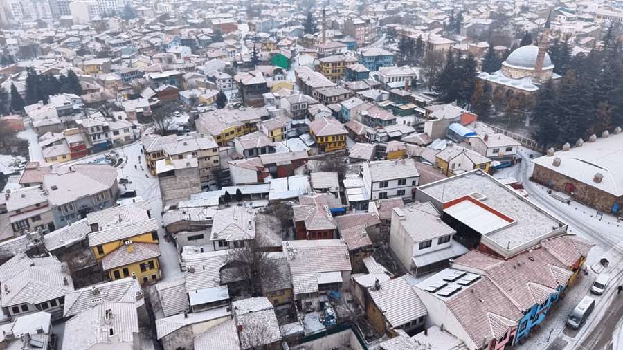 Kar yağışı nedeniyle oluşan bu eşsiz manzara, drone ile havadan görüntülenerek ölümsüzleştirildi. Havadan çekilen görüntülerde, Odunpazarı’nın özgün mimarisi ve tarihi dokusu karla bütünleşerek izleyenlere görsel bir şölen sundu.