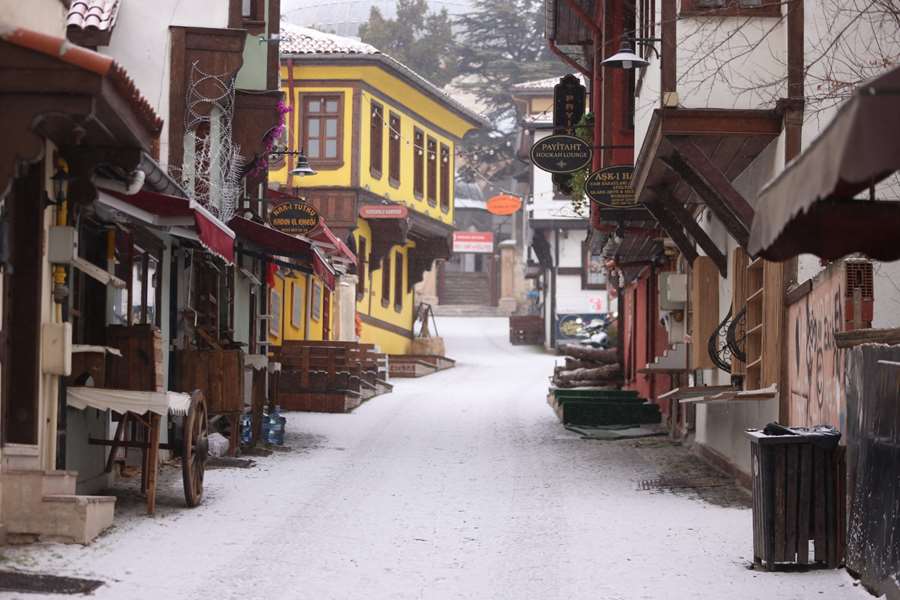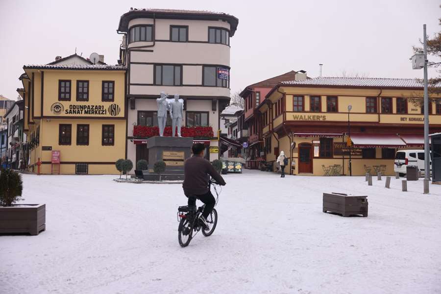 Gündüz saatlerinde etkisini göstermeye başlayan kar yağışı, Eskişehir’i kısa sürede beyaz bir örtüyle kapladı. Kentin en önemli kültürel ve turistik noktalarından biri olan Tarihi Odunpazarı Bölgesi, yağan karla birlikte adeta kartpostallık görüntülere sahne oldu. Bölgedeki tarihi evlerin ve dükkânların çatıları beyaza bürünürken, ortaya çıkan manzara görenleri kendine hayran bıraktı.